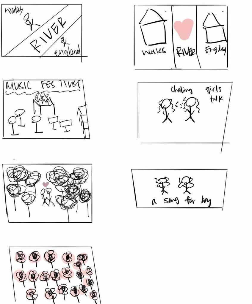A storyboard for the music video, with my bad drawing. This is a storyboard of my basic idea by the time I still not clear of what I want to do, the main concept is only a memory music video.