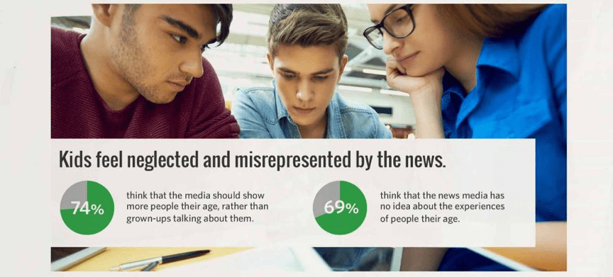 It used chart to show the comparison between the data of how young people perceive and are impacted by the news. In second part of the infographic, it used pie chart to show the data of kids feel neglected and misrepresented by the news. There is 74% of child think that the media should show more people their age, rather than grown-ups talking about them. Another pie chart shows 69% child think that the news media has no idea about the experiences of people their age.